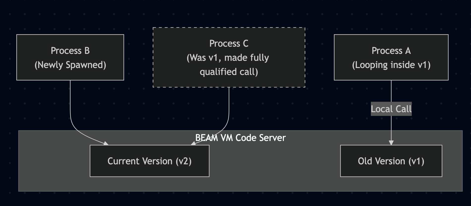 The Erlang Runtime System (ERTS) uses a code server, basically a running process that keeps track of compiled code that's been loaded into the BEAM VM. The system is set up to keep two versions of code, a "current" version and an "old" version. What this means is that if you're an actor running the "old" version of the code, your local calls will still get routed to the "old" version, while newer fully qualified remote calls will get routed to the "current" version of the code.